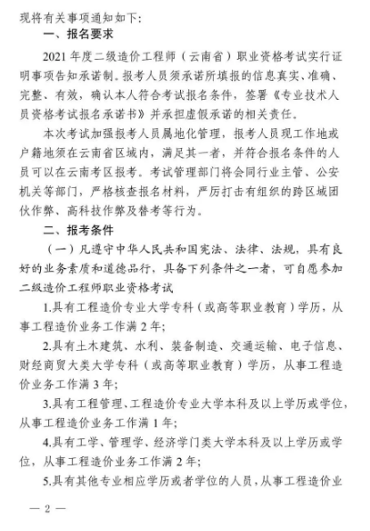 云南省2021年二級(jí)造價(jià)工程師職業(yè)資格考試報(bào)名工作通知