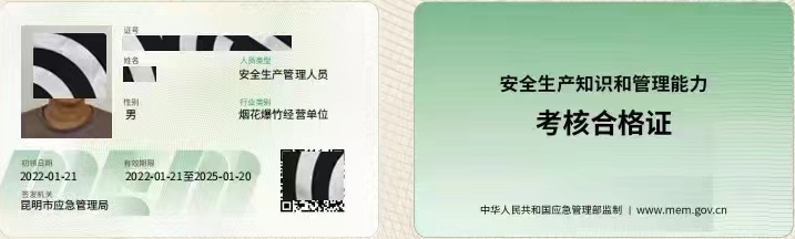 一、煙花爆竹經(jīng)營單位《安全生產(chǎn)合格證》,由應(yīng)急管理局頒發(fā),資格類型:企業(yè)主要負(fù)責(zé)人和安全生產(chǎn)管理人員,證書有效期三年,全國通用!