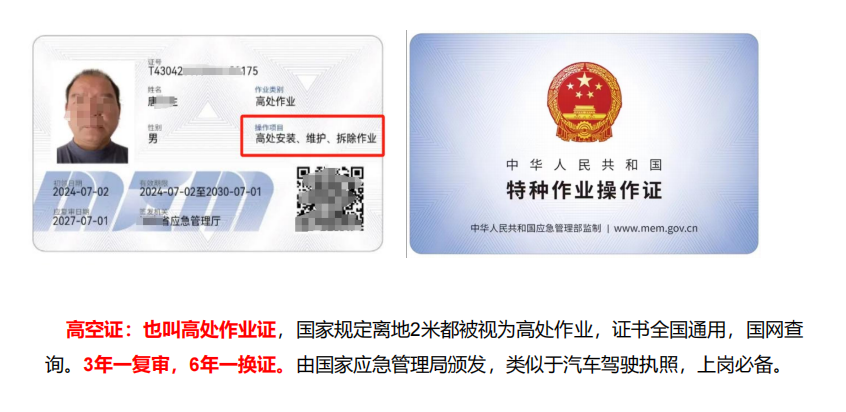 高處安裝、拆除、維護作業(yè)證是由應(yīng)急管理部門頒發(fā)的特種作業(yè)操作證,屬于《特種作業(yè)目錄》中 “高處作業(yè)” 類別的核心資質(zhì)(準操項目代碼:高處作業(yè) - 高處安裝、維護、拆除作業(yè))。其核心職能是在墜落高度基準面 2 米及以上的環(huán)境中,從事各類設(shè)備、結(jié)構(gòu)、設(shè)施的安裝、拆除與日常維護,與 “登高架設(shè)作業(yè)證” 的核心區(qū)別在于:前者側(cè)重 “架體搭設(shè)”,后者側(cè)重 “已有設(shè)施的操作與維護”。該證書全國通用,有效期 6 年,每 3 年需復(fù)審 1 次,是從事高空設(shè)備操作的法定資質(zhì)。
