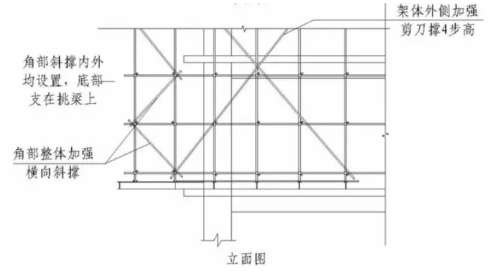 4、斜撐(也稱斜戧、八字撐):與腳手架外排立桿緊貼連接,與其立桿斜交并與地面形成45°-60°角,上下連續(xù)設(shè)置,形如“之”字。主要設(shè)置在腳手架拐角處,其作用是防止架子沿縱長(zhǎng)方向傾斜并承受腳手架的水平作用力。