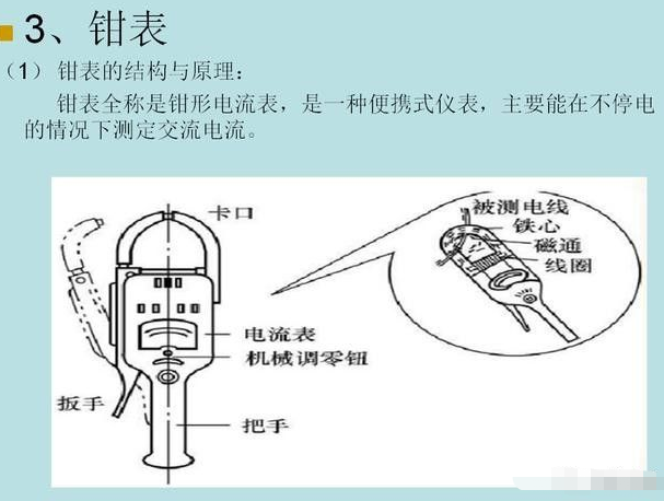 握緊鉗形電流表的把手時,鐵心張開,將通有被測電流的導(dǎo)線放入鉗口中。松開把手后鐵心閉合,被測載流導(dǎo)線相當(dāng)于電流互感器的一次繞組,繞在鉗形表鐵芯上的線圈相當(dāng)于電流互感器的二次線圈。于是二次繞組便感應(yīng)出電流,送入整流系電流表,使指針偏轉(zhuǎn),指示出被測電流值。(電流表的刻度按一次側(cè)電流刻度的)