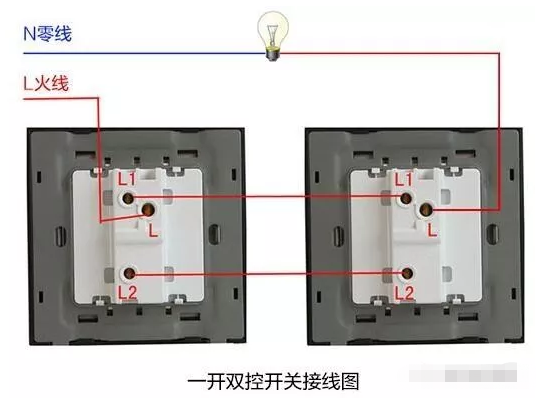 單開雙控開關,后面有三個觸點,分別是L、L1、L2。把兩個L1、L2分別用線連起來,火線接在一個雙控開關的L觸點上,零線接在另一個雙控開關的L觸點上。