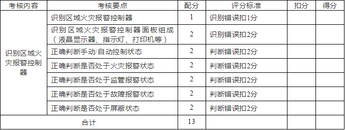 一、設(shè)施監(jiān)控鑒定點一:區(qū)域火災(zāi)報警控制器識別及工作狀態(tài)判斷★1.考場準(zhǔn)備:區(qū)域火災(zāi)報警控制器、按照考核需要分別設(shè)置火災(zāi)報警信息、監(jiān)管報警信息、故障報警信息、屏蔽信息等。2.考核要求:能正確識別區(qū)域火災(zāi)報警控制器,掌握其組成、功能和特征,能正確判斷區(qū)域火災(zāi)報警控制器的各類工作狀態(tài)。3.考核時間:5分鐘。4.配分與評分標(biāo)準(zhǔn):