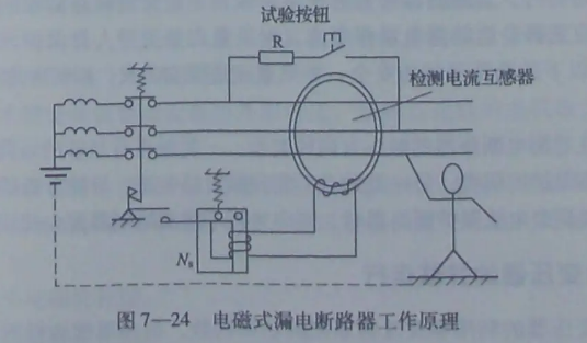 1)電磁式漏電斷路器工作原理 電磁型漏電斷路器原理如圖7—24 所示。其結(jié)構(gòu)是在一般的塑殼斷路器中增加一個能檢測剩余電流的感受組件(檢測電流互感器)和剩余電流脫扣器。在正常運行時,各相電流的相量和為零,檢測電流互感器二次側(cè)無輸出。當(dāng)出現(xiàn)漏電(剩余電流)或人身觸電時,則在檢測電流互感器二次線圈感應(yīng)出剩余電流。漏電斷路器受此電流激勵,使斷路器脫扣而斷開電路。