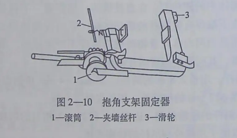 2)抱角支架固定器。每個抱角支架需要兩個固定器分別卡在轉(zhuǎn)角處兩外墻窗口的墻上,再用兩根鋼絲繩分別拉住抱角支架支柱的上、下兩端,使抱角支架懸掛在建筑物的墻角處,如圖2—10 所示。