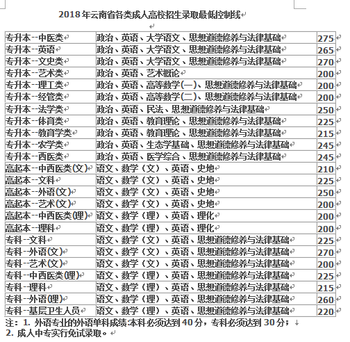 2019年云南省成人高考考試錄取分?jǐn)?shù)線