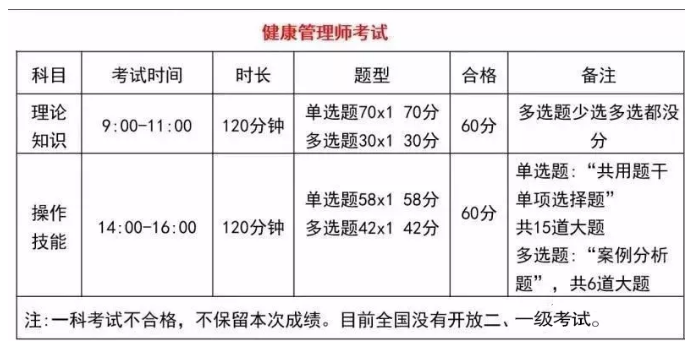 各科滿分100分,均達到60分為合格。兩科必須一次通過才能取得健康管理師證書。