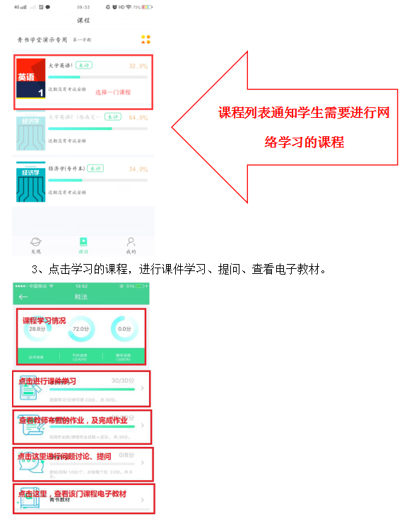 學生也用學號和密碼直接登錄繼續(xù)教育學院管理系統(tǒng),點擊課程名稱,若該該門課程為網(wǎng)絡授課則直接跳轉至“青書學堂”本門課程界面直接進行學習。