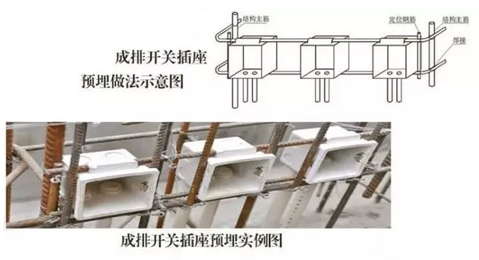 成排開關(guān)插座安裝:根據(jù)結(jié)構(gòu)1000mm線和結(jié)構(gòu)墻面線,確定成排線盒的高度及位置,墻內(nèi)主筋做上標(biāo)記,上下用兩根鋼筋穿接線盒,兩側(cè)加短鋼筋與結(jié)構(gòu)立筋焊接定位,盒口與模板面應(yīng)平齊,固定端正牢靠,間距均勻。