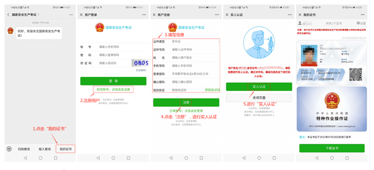 方法1:使用手機(jī)關(guān)注官方微信公眾號(國家安全生產(chǎn)考試),按要求注冊并進(jìn)行實(shí)人認(rèn)證后,在“我的證書”功能下載打印電子證書。