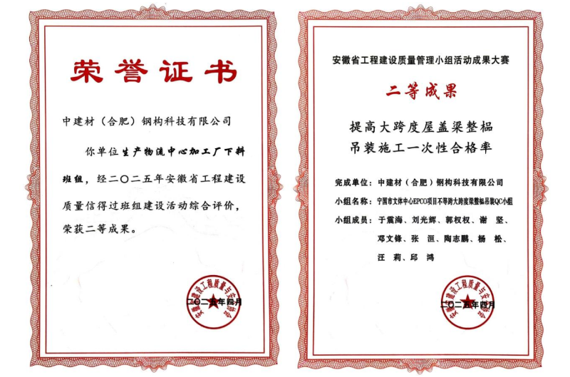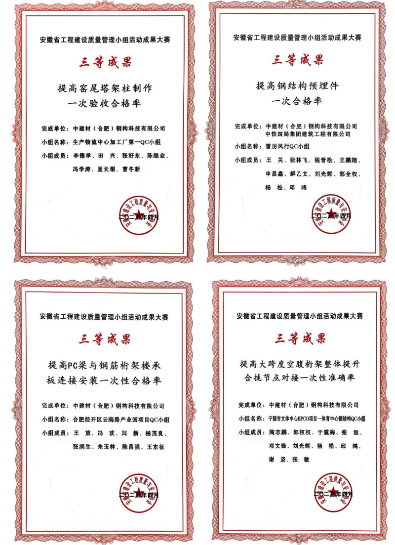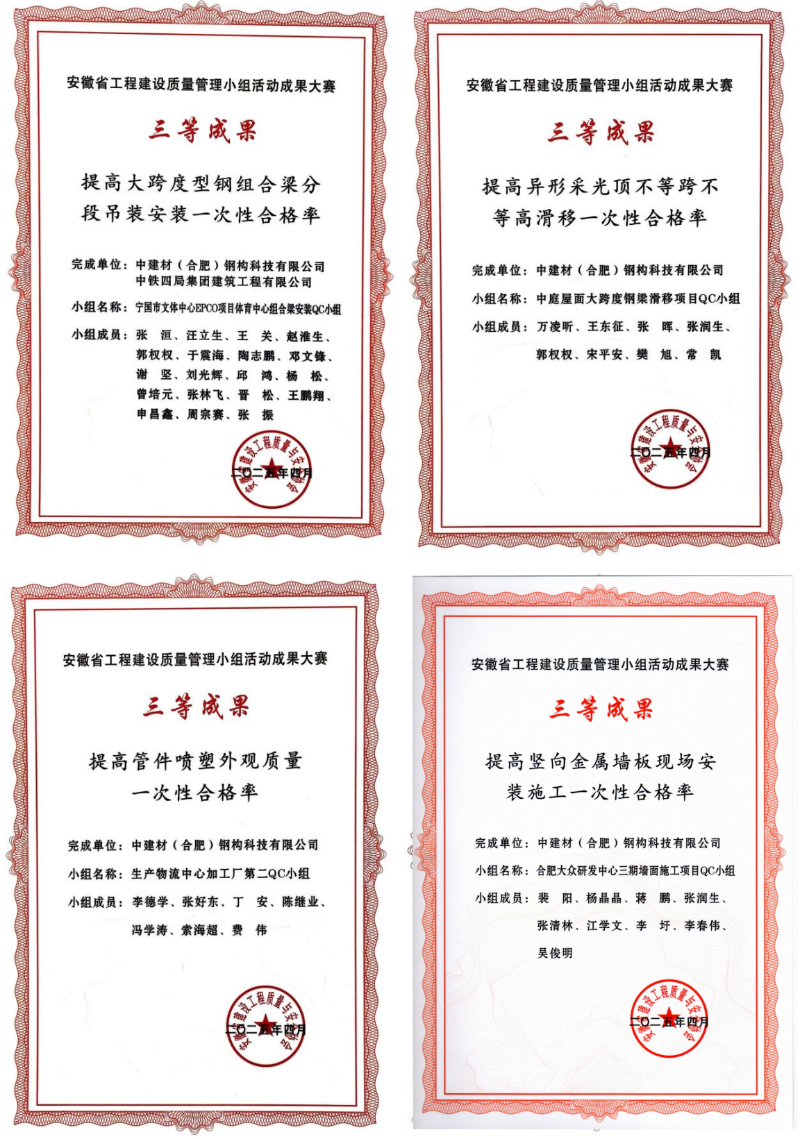 近日,在安徽省工程建設(shè)質(zhì)量管理小組活動成果大賽上,中建材鋼構(gòu)公司憑借扎實的技術(shù)功底、卓越的質(zhì)量管理水平和持續(xù)的創(chuàng)新精神,一舉斬獲10項優(yōu)秀成果大獎!其中包括2項二等獎、8項三等獎,獲獎數(shù)量和質(zhì)量均位居行業(yè)前列,充分展現(xiàn)了中建材鋼構(gòu)公司在工程建設(shè)領(lǐng)域強(qiáng)大的綜合實力和核心競爭力。
